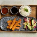 Kombinasjon av vårruller, fritert scampi, fritert kylling, kyllingspyd og løkringer. Serverer med ris, chilisaus og peanøttsaus