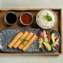 Alt i en pakke. Velg din favoritt fra hovedrett å få med både vårruller 2 stk og sushi 4 små stk.