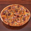 Pizza med tomatsaus, ost, biffkjøtt, bacon og pepperoni.