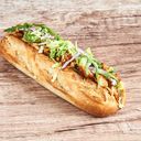 Baguette med egg, tunfisk, salat, agurk, paprika, rødløk og majones.