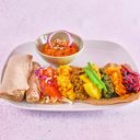 Wraps fylt med grønne linser, løk, fersk chili og ingefær, stekt i vegetabilsk olje. Serveres med awaze.