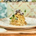 Fersk fettuccine pasta med trøffelkrem, svart pepper og revet parmesanost.