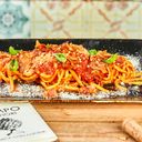 Tonnarelli med pecorino ost, San Marzano tomatsaus, chili og Guanciale.