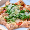 Porsjonspizza med tomat, mozzarella, parmesan,philadelphia, parmaskinke og ruccula
