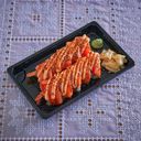 10 biter futo maki med fritert scampi, chilimajones og avokado, toppet med laks, teriyakisaus og sesamfrø.