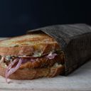 Smeltet pepperbrie med stekt spekeskinke på smørstekt surdeigsbrød. Kommer med bifftomat, isberg salat, syltet rødløk, mangodressing og honning.