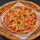Pizza med tomatsaus, ost, skinke, marinert biff, salami og pepperoni.