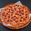 Pizza med tomatsaus, ost, biff og pepperoni.