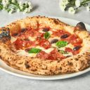 Pizza med tomatsaus, mozzarella fior di latte d Agerola, sterk salami og oliven