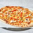 Pizza med tomatsaus, ost, paprika, champion, mais, rødløk og oliven. Velg størrelse.