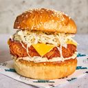 Fried Chicken Breast with Honey Mustard Slaw, Cheddar Cheese & Pickle Relish Aioli. Choose your own spice level.