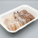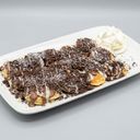 Mini-pancakes smøret med fløyselsmyk nugatt, halv hvit og halv sjokolade saus. Serveres med kuleis.