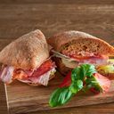 Sandwich med pepperoni, salat, tomat og mozzerella.
