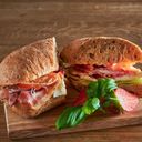 Sandwich med kalkun, skinke, bacon, salat og tomat.