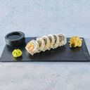 8 biter maki med fritert sandkrabbe, agurk, chilimajones toppet med avokadolokk og lakserogn.