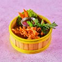 Fem fylte pastablader med kylling, scampi og løk. Serveres med søt chilisaus.