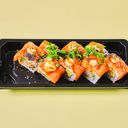8 stk. uramaki med fritert scampi, avokado, kremost, chilimajones, vårløk, teriyakisaus og laks på toppen.