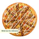 Pizza med tomatsaus, kebab, pommes frites og kebabdressing. Velg størrelse.