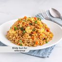 Stekt ris med hvitløk og grønnsaker. Velg mellom kylling, biff, scampi og tofu.