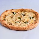 Pizza med mozzarella, parmesan, valnøtter, persille, pepper, gorgonzolakrem og trøffelsaus.