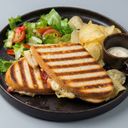 Toast m/ Kylling og Bacon. Serveres med salat, salt potetgull og Aioli.