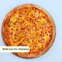 Pizza med tomatsaus, mozzarella, pepperoni, skinke, bacon og ananas.