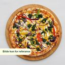 Pizza med tomatsaus, mozzarella, løk, paprika, champignon, mais, tomat og oliven.