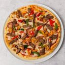 Pizza med marinert biffkjøtt, løk, paprika og sjampinjong.