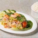 Lun glassnudelsalat med scampi, kylling, selleri, lime, vårløk, løk, koriander, chili og tomat. Serveres med ris.