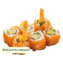 8 biter. Tempura scampi med avokado, mango, tobiko og Philadelphia ost.