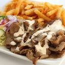 Grillet kebabkjøtt med salat, agurk, tomat,løk, mais,pommes og dressing.