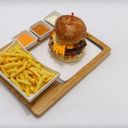 Biffkjøtt, pommes, salat, paprika, lokk, agurk, tomat, dressing.