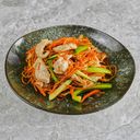 Stekte nudler med egg og grønnsaker. Velg mellom kylling, biff eller svin.