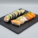 16 biter. 8 nigiri: 4 laks, 1 tunfisk, 1 kveite, 1 kamskjell og 1 scampi. 8 spicy laks maki. Medfølger soyasaus, wasabi og ingefær.