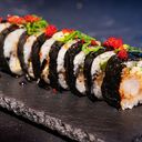 Fritert scampi med avokado, agurk og crabstick rullet i rispapir. Toppet med flambert cheddar, teriyakisaus og topping. Medfølger soyasaus, wasabi og ingefær.