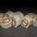 8 biter maki med fritert scampi, chilimajo, teriyaki og toppet med avokado, rogn