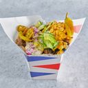 Kylling med pommes frites og saus. Serveres med mais, tomat, salat, løk og agurk. Velg størrelse.