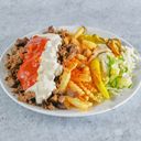 Kebabkjøtt med pommes frites og saus. Serveres med mais, tomat, salat, løk og agurk. Velg størrelse.