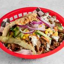 Biffkjøtt med salat og dressing. Velg mellom pita eller rull.
