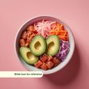 Risbolle med fritert tofu, augurk, avocado, gomasalat kimchi, sesamfrø, chilimajones og teriyaki saus.