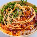 Risbolle med fritert kylling, augurk, avocado, gomasalat kimchi, sesamfrø, chilimajones og teriyaki saus.