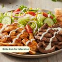 En kombinasjon av marinert kylling og biffkjøtt. Serveres med isbergsalat, tomat, agurk, rødløk, mais og rikelig med dressing.