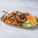 Kyllingtallerken med salat, løk, gyroskjøtt, pommes frites og saus.