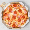 Stor Pizza med tomatsaus, ost, biff, skinke og bacon.