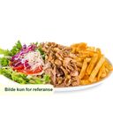 Kebabtallerken med salat, mais, løk, agurk og kebabsaus. Serveres med pommes frites og brød.