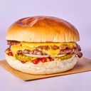 Burger med hamburgerdressing, crispy salat, tomat, syltet rødløk, cheddar ost, ferske jalaoenos og creamchees.