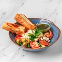 Salat med fetaost, tomat, ruccola, rødløk, parmesan, oliven og avokado.