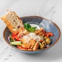 Salat med marinert kylling, løk, avokado, tomat, parmesan og hvitløksdressing.