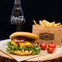 Beef med salat, HOB burgerdressing, cherrytomat, bacon, cheese og karamellisert løk meal inkl. Fries og drikke.
