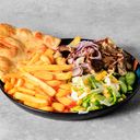 Kebab kjøtt i tallerken med isberg salat, agurk, tomat, løk, mais, pommes frites pitabrød og saus. Velg styrke.